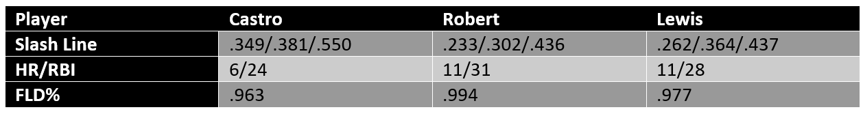 The only area Castro did not live up to his competitors was Fielding Percentage, however, I believe if he had a full season’s chances and more time to get his feet under him at the positions he played his percentage would be .975 or higher. Castro is under team control until 2026 when he becomes an Unrestricted Free Agent.